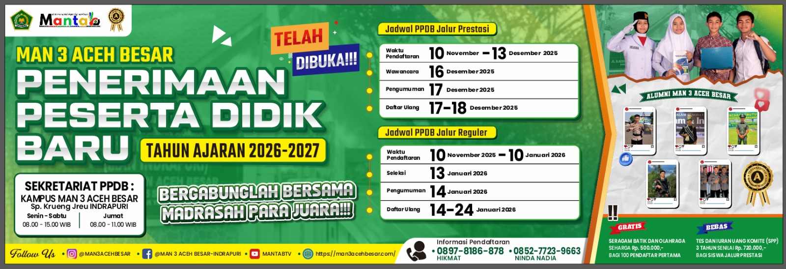Puji syukur kehadirat Allah SWT, atas rahmat dan karunia-Nya, kami dapat mempersembahkan kembali website resmi Madrasah Aliyah Negeri (MAN) 3 Aceh Besar, dengan alamat www.man3acehbesar.sch.id.